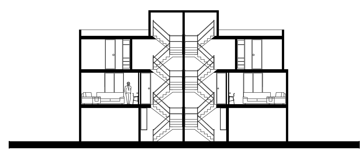 The left side cut section view of the 23x16m architecture triple duplex house building