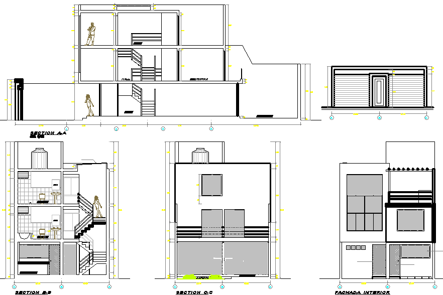 This 3 Story House AutoCAD DWG file presents a complete architectural design, including detailed plans, sections, and elevations. The drawing clearly outlines room layouts, floor connections, staircases, and facade elements. The sectional drawings provide a realistic view of the structural composition, including the height alignment of each floor, wall thickness, and interior detailing. The elevation view highlights the modern exterior finish with a combination of windows, balconies, and decorative cladding, offering a well-balanced visual appeal.