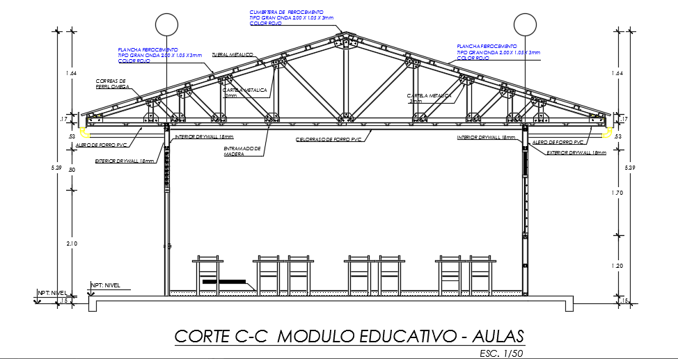 The right side cut section view of the 24x8m college building Autocad drawing is given in this file. This is single story college building. On this floor plan, three class rooms are available. On each class, furniture’s are provided. The total height of the college building is 5.39m. For more details download the AutoCAD drawing model from our cadbull website. Thank you for downloading the AutoCAD files from our cadbull website.