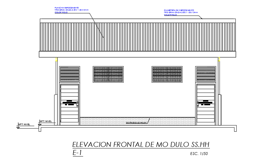 The front elevation view of the 8x7m college toilet building AutoCAD 2D drawing is given in this model. In this, gent’s and ladies toilets are provided. The total height of the toilet building is 5.39m. In ladies toilet, 8 water closets are available and 5 wash basins are available. On gent’s toilet, 5 water closet, and 5 wash basins are available. For more details download the AutoCAD drawing model from our cadbull website. Thank you for downloading the AutoCAD files from our cadbull website.