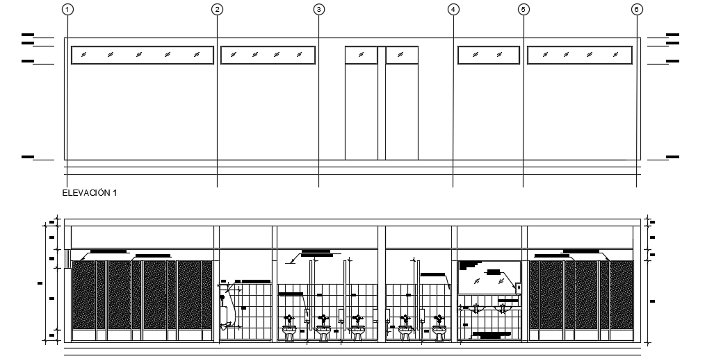 An elevation and section view of the 15x5m industrial toilet building AutoCAD drawing