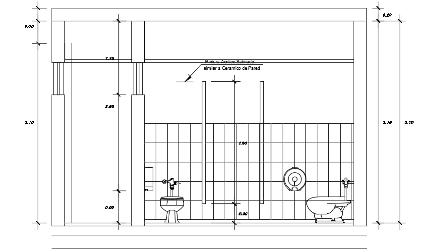 The right side section view of the 15x5m industrial toilet building AutoCAD drawing is given in this file. The total height of the toilet building is 3.15m. On this plan, gent’s and ladies toilet is available. For more details download the AutoCAD drawing model from our cadbull website. Thank you for downloading the AutoCAD files from our cadbull website.