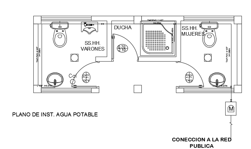 The door location view of the 5400x2000mm toilet plan AutoCAD drawing is given in this file. The total height of the toilet building is 3.4m. On this plan, gent’s and ladies toilet is available. For more details download the AutoCAD drawing model from our cadbull website. Thank you for downloading the AutoCAD files from our cadbull website.
