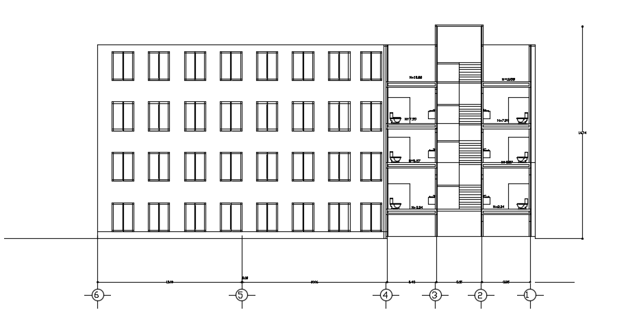 The left side cut section view of the 20x30m four story college building AutoCAD DWG file