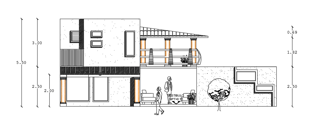 The front elevation view of the 14x6m architecture two story house building cad drawing