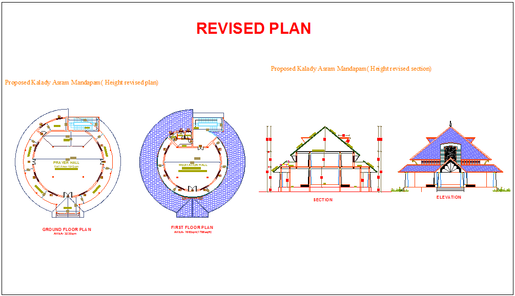 Design of ashram with sectional view dwg file with prayer and meditation hall and