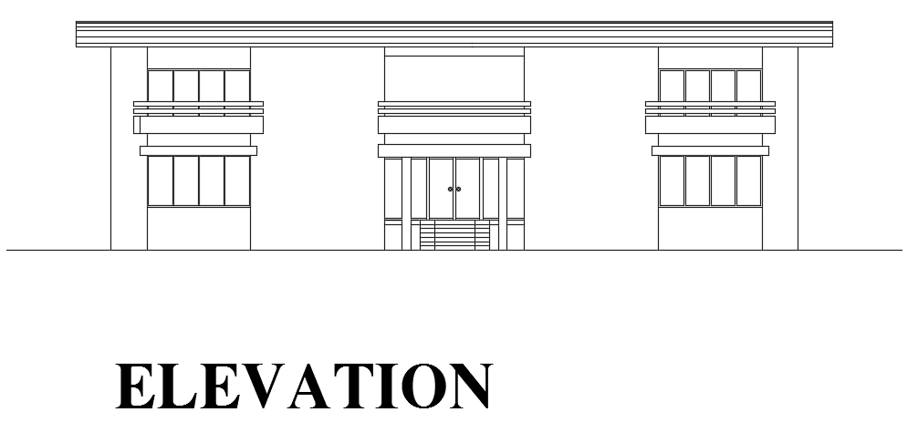 The front elevation view of the function hall building 2d AutoCAD drawing is given in this file