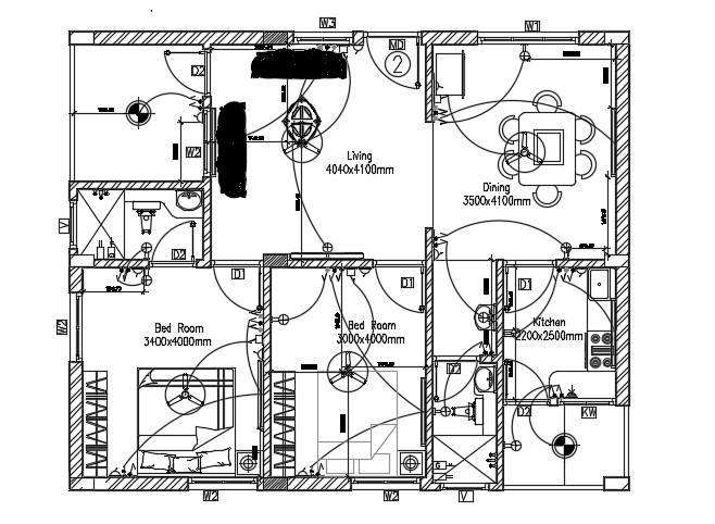 The ceiling fan location of the 25x20m apartment floor plan drawing is given in this file