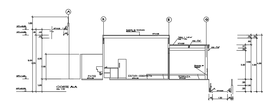 The right side section view of the 7x12m architecture one story house building cad drawing is given in this file. This is a 2bhk house plan. On this floor plan, the living room, kitchen, master bedroom with the attached toilet, dining area, master bedroom, patio, open terrace, and common bathroom is available. For more details download the AutoCAD drawing model is given in this file. Thank you for downloading the AutoCAD drawing model from our cadbull website.