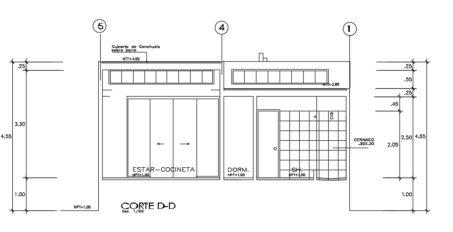 The front cut section view of the7x12m architecture one story house building cad drawing
