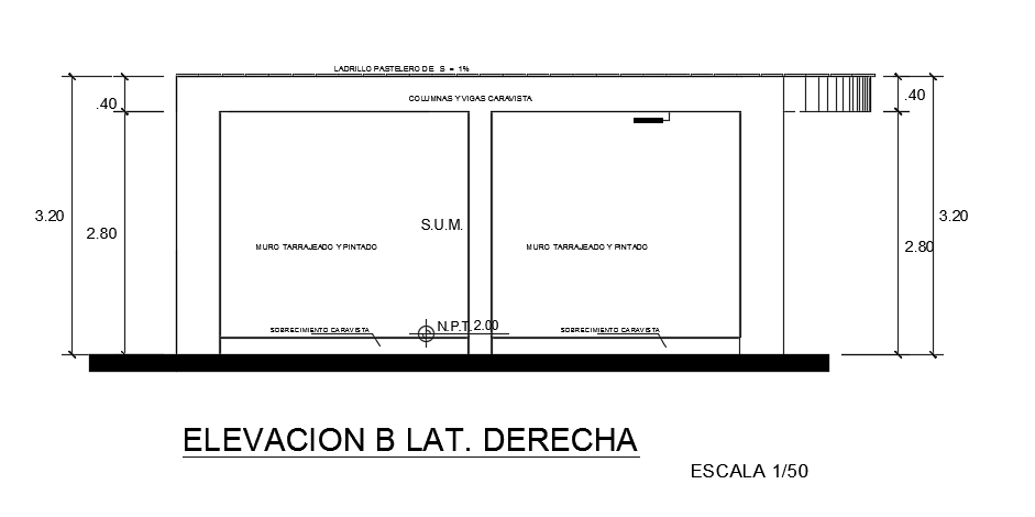 The right side elevation view of the 20x7m college multipurpose room building cad drawing is given in this file. This is single story building. For more details download the AutoCAD drawing model is given in this file. Thank you for downloading the AutoCAD drawing model from our cadbull website.