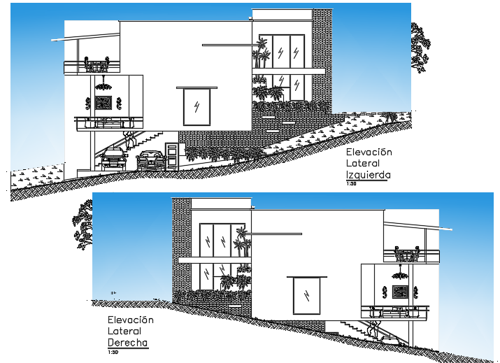 The right side elevation view of the 22x25m architecture duplex house building cad drawing is given in this file. This is G+ 1 villa building. On this ground floor, the car parking, path way, garden, living room, kitchen, dining area, lavanderia, family room, and common bathroom is available. On this first floor, the living room, master bedroom with the attached toilet & balcony, guest bedroom, kid’s bedroom, and common bathroom is available. For more details download the AutoCAD drawing model from our cadbull. Thank you for downloading the AutoCAD files from our cadbull website.