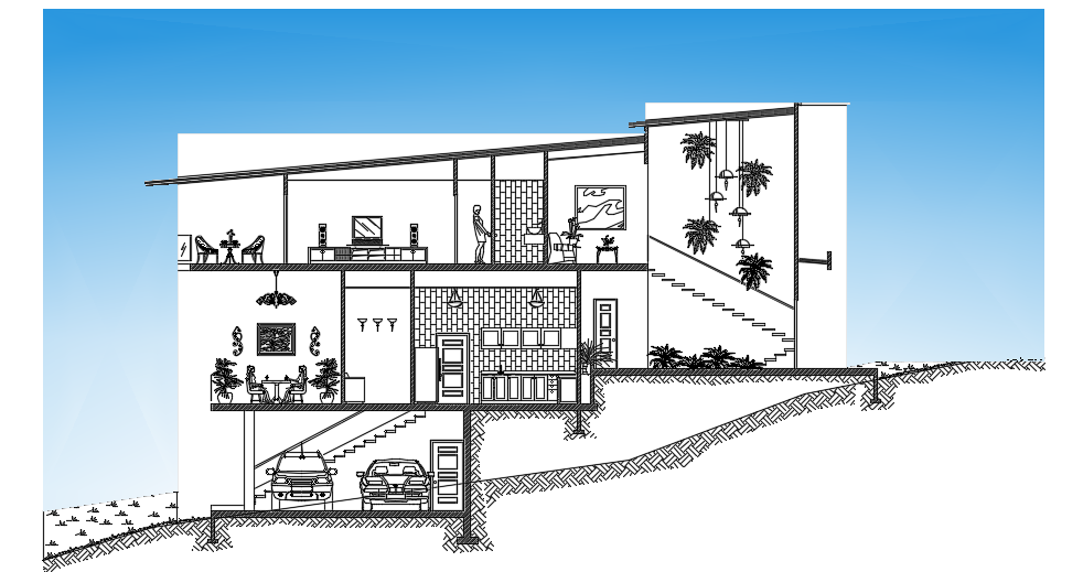 The left side elevation view of the 22x25m architecture duplex house building cad drawing is given in this file. This is G+ 1 villa building. On this ground floor, the car parking, path way, garden, living room, kitchen, dining area, lavanderia, family room, and common bathroom is available. On this first floor, the living room, master bedroom with the attached toilet & balcony, guest bedroom, kid’s bedroom, and common bathroom is available. For more details download the AutoCAD drawing model from our cadbull. Thank you for downloading the AutoCAD files from our cadbull website.