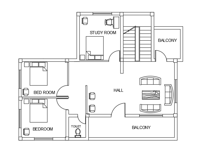 This DWG drawing shows a first-floor layout plan for a 13x10m two-storey residential house, designed to deliver clarity in architectural planning. The floor plan includes a master bedroom, guest bedroom, study room, common bathroom, and two balconies, providing balanced space allocation and circulation. Each room is positioned to maximize natural light and ventilation, while ensuring practical connections among the living areas. This layout is suited for architects, design students, and home planners seeking realistic residential home plan references.