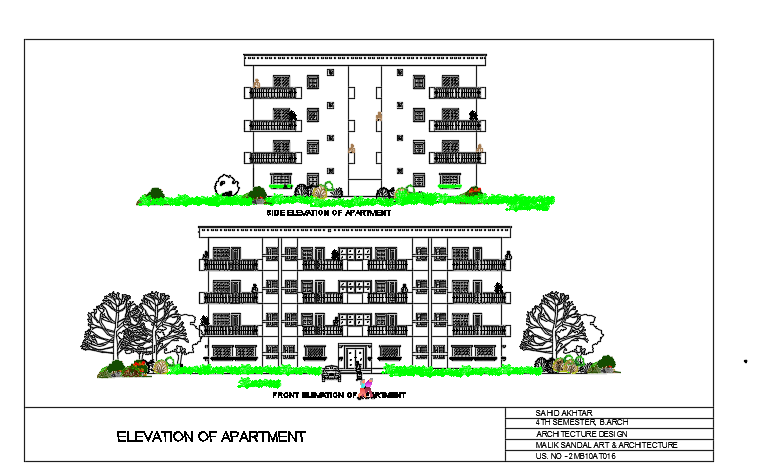 The main elevation view of the 27x20m apartment house building 2d AutoCAD drawing is given in this file. This is G+ 3 apartment house building. On this ground floor plan, four houses are available. These houses are consists of the living room, kitchen, utility area, dining room, master bedroom with the attached toilet & balcony, kid’s bedroom with the attached balcony, and common bathroom. On this second floor plan, four houses are available. These houses are consists of the living room, kitchen, utility area, dining room, master bedroom On this third with the attached toilet & balcony, kid’s bedroom with the attached balcony, and common bathroom. floor plan, four houses are available. These houses are consists of the living room, kitchen, utility area, dining room, master bedroom with the attached toilet & balcony, kid’s bedroom with the attached balcony, and common bathroom. For more details download the AutoCAD drawing model from our cadbull. Thank you for downloading the AutoCAD files from our cadbull website.