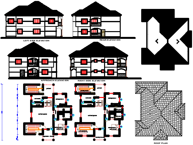 the architecture layout plan of ground floor plan and first floor plan, roof plan, section plan and elevation design of Roman house project detail.