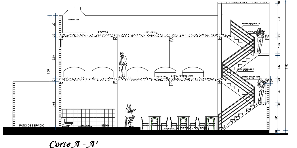 A section view of the 7x15m hostel building 2d AutoCAD drawing is given in this file