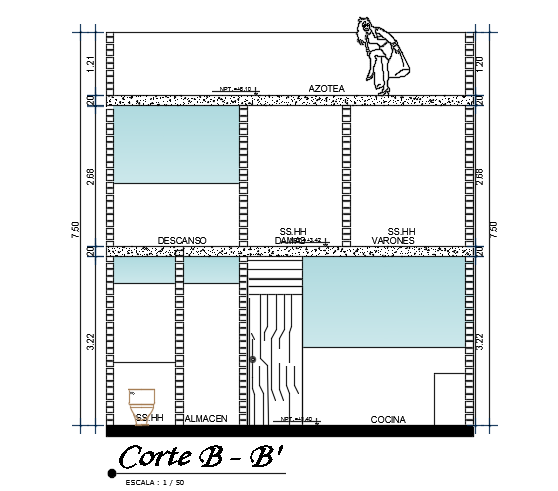 The front cut section view of the 7x15m hostel building 2d AutoCAD drawing