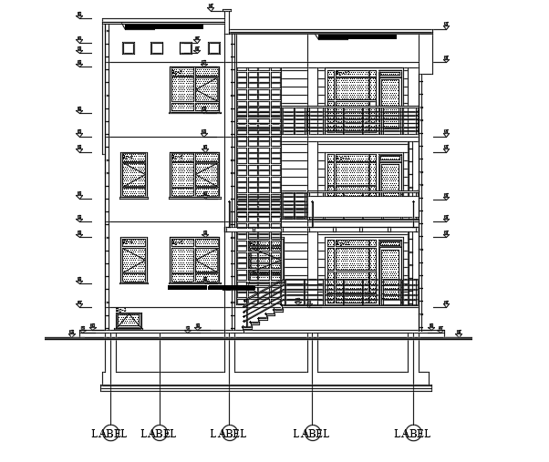 The back side elevation view of the 12x15m house building plan shows the detailed layout of a G+3 structure. This CAD model plan features a ground floor with car parking, a living room, a kitchen, a dining area, a family area, and a common bathroom. On the first floor, there is a living room, a master bedroom with an attached toilet, a kid’s bedroom, a guest bedroom, and another bathroom. The second floor includes a living room, a master bedroom, and a common bathroom. The CAD model is ideal for architects and designers reviewing house elevation designs.