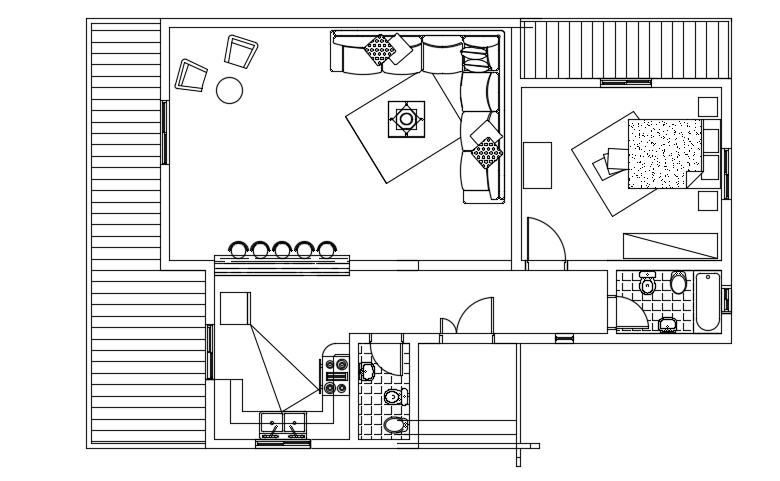 14x10m 1BHK House Plan DWG with Living Room Kitchen and Two Baths