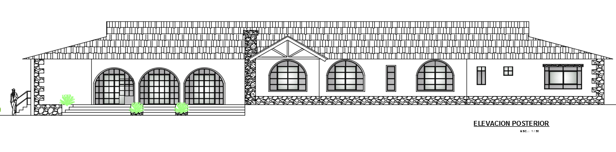 The back side elevation view of the 38x13m architecture one story villa building AutoCAD drawing