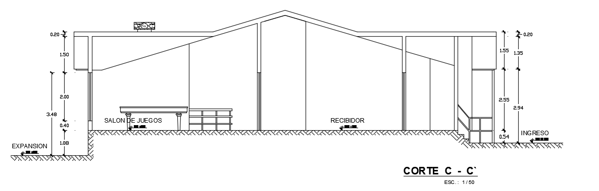 The right side section view of the 38x13m architecture one story villa building AutoCAD drawing is given in this file. On this floor plan, the living room, kitchen, dining area, servant room with the attached bathroom, guest room with the attached toilet, family hall, patio service, breakfast corner, music room, master bedroom with the attached bathroom, two kid’s bedroom with the attached bathroom, guest room with the attached bathroom, and passage is available. For more details download the AutoCAD drawing model from our cadbull. Thank you for downloading the AutoCAD files from our cadbull website.