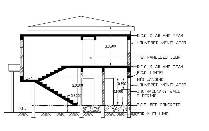 The left side section view of the 12x8m two story house building cad drawing model is given in this file. On this ground floor plan, a parking, verandah, drawing hall, study room, kitchen, and common bathroom & toilet is available. On this first floor plan, the master bedroom with the attached toilet, children’s bedroom with the attached bathroom, guest bedroom, and balcony is available. For more details download the AutoCAD drawing model from our cadbull. Thank you for downloading the AutoCAD files from our cadbull website.