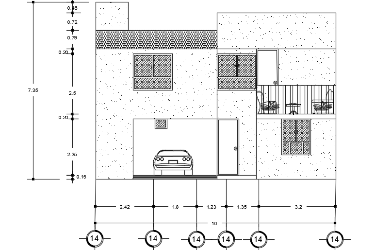 The front elevation view of the 10x15m architecture two story house building cad drawing