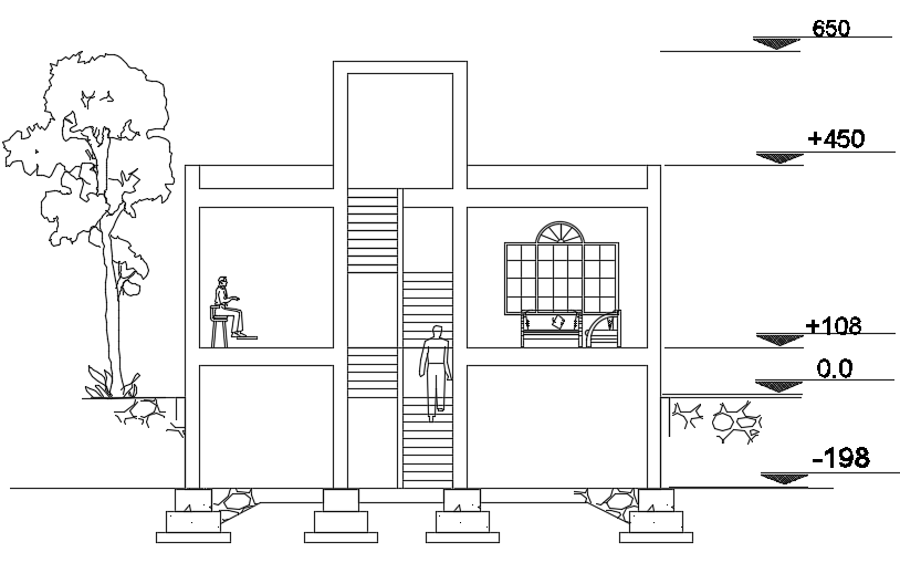 The front cut section view of the 11x15m architecture house building 2d AutoCAD DWG drawing is given in this file