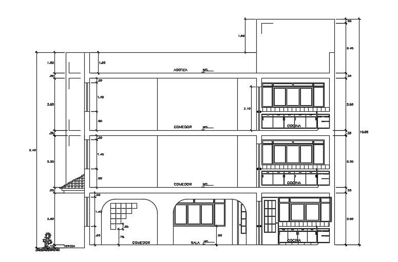 The left side elevation view of the 12x23m three story residential building cad drawing is given in this file. This is G+ 2 house building. On this ground floor house plan, a car parking, living room, kitchen, dining area, master bedroom with the attached toilet, terrace, lavanderia, and common bathroom is available. On this first floor house plan, guest bedroom, living room, kitchen, dining area, master bedroom with the attached toilet, terrace, lavanderia, and common bathroom is available. On this second floor house plan, guest bedroom, living room, kitchen, dining area, master bedroom with the attached toilet, terrace, lavanderia, and common bathroom is available. For more details download the AutoCAD drawing model from our cadbull. Thank you for downloading the AutoCAD files from our cadbull website.