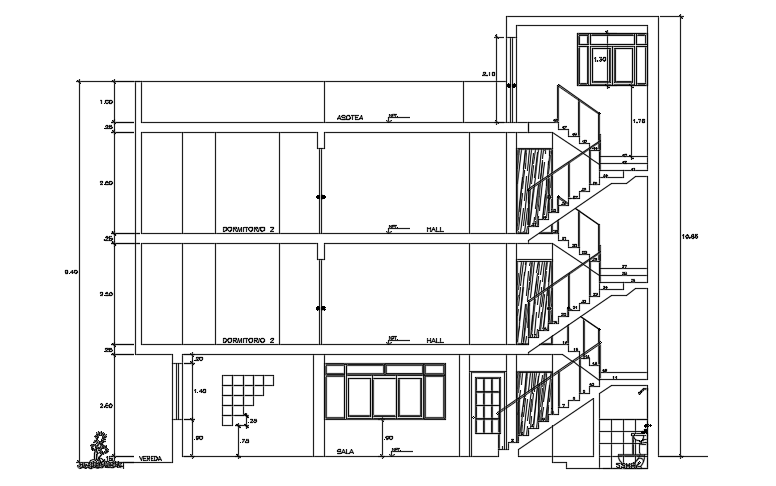 The left side section view of the 12x23m three story residential building cad drawing