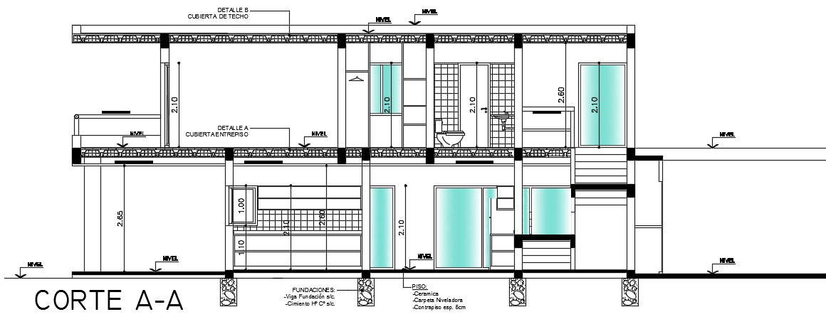 The left side section view of the 4x20m two story residential building cad 2d DWG drawing file
