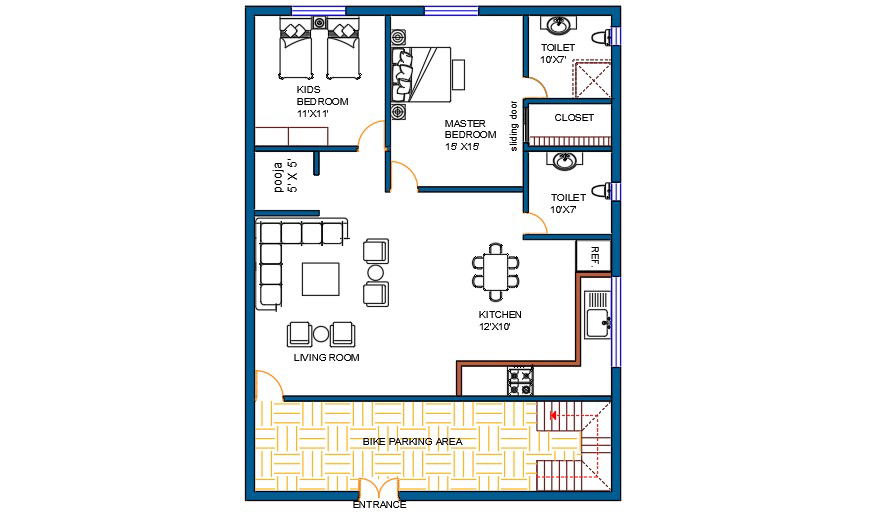 This architecture AutoCAD 2d drawing include one master bedroom with attached bathroom, one kids room, living area, kitchen with dinning area, pooja room and also parking space. For more details download the file.