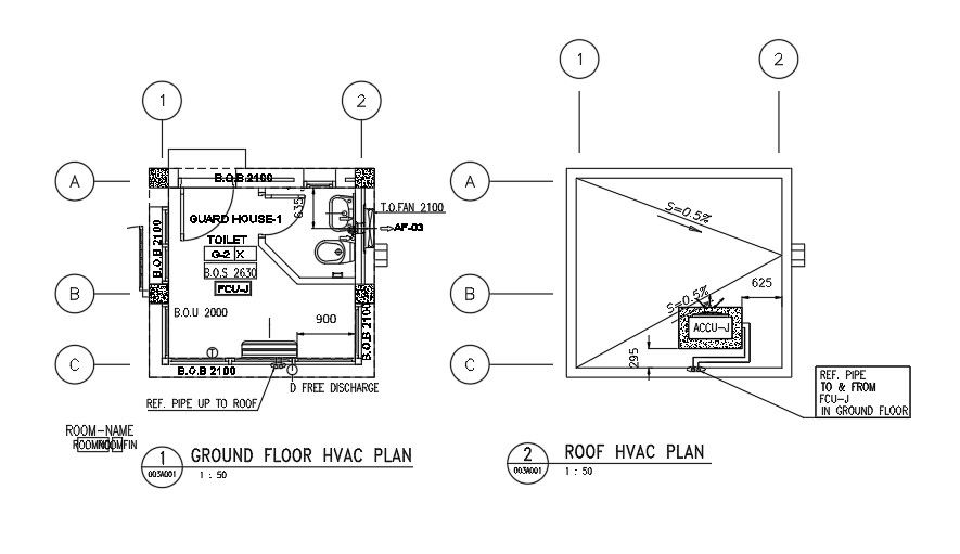 Ground and roof HAVC detailed plan detail floor drawing and level of floor also shown plumbing details and HAVC detailed including free discharge, exhaust fan, piping hole, WC , wash basing , with flooring details of both plan and also show detailing of dimension shown in plan