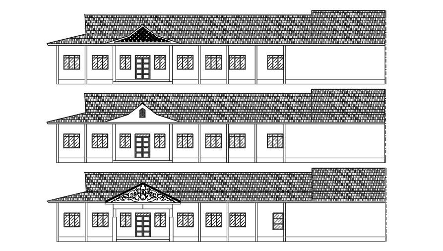This architecture drawing is of exterior front elevation. In this drawing file, there are three elevation of the same villa, but with different styles of design, this architecture residential building is a single story building. In this drawing, the roof of the entrance has different style of design. For more details and knowledge download the file.
