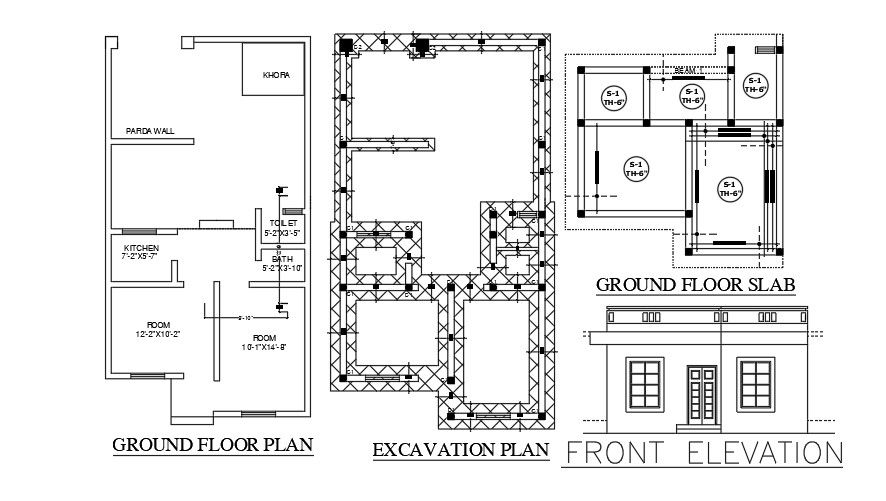 House plan details with elevation and floor, excavation plan, house plan shows ground floor includes drawing room, living room , kitchen, toilet, bedroom. balcony, store room and passage. courtyard is also available in this file. Also include front elevation , ground floor slab plan. in this plan also give passage that is convenient for sufficient space, for more details of house plan download this file.