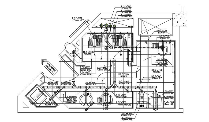 This Architectural Drawing is of drainage pipeline layout of toilet in commercial building. This is a 5 story commercial building. Plumbing system is used for water supply in building .It supplies water to kitchen toilet outlets via distribution system of pipes. Drainage system is used to get rid of human wastes through well-arranged network of drainage pipes. Cast iron soil pipe and fittings are mainly used in building construction for sanitary and storm drains, waste and vent piping systems. The natural qualities of cast iron make it an ideal material for use in drain, waste and vent applications without the need for additional linings and coatings. Cast iron pipe and fittings also resist corrosion for solutions commonly found in these drain, waste and vent systems. For more details and information download the drawing file.