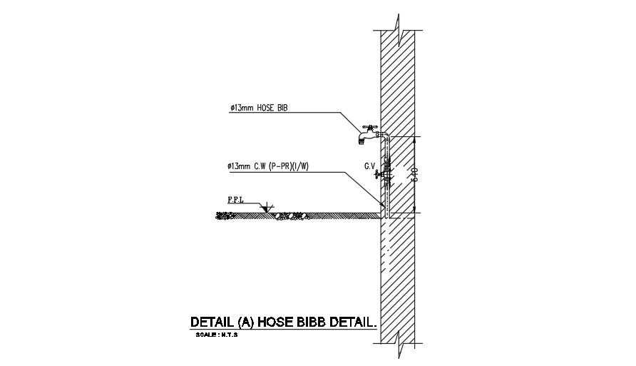 This Architectural drawing is plumbing details of Hose BIBB In a building. The hose bib is the small faucet on the exterior of your house. It's essentially an outdoor tap that allows you to run water from the inside of your house to the outside. You use this tap to attach your garden hose for many different jobs. The bib tap is made of brass and is primarily used as an outside tap or garden tap to provide an external water supply. The bib tap has a 1/2' inch male thread which makes it easy to connect on to a wall mounted fixing joined to a water pipe. Water pressure can be adjusted through the bib tap by adjusting the handle. For more details download the file.