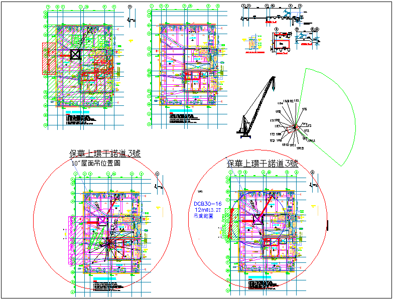 Layout plan of crane dis mental view dwg file with crane and beam view with dimensional detail,rotation of crane and wall and column view with position of working of crane.