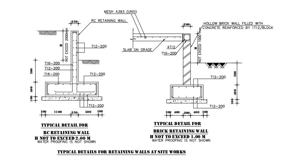 this Architectural design is Typical details for retaining walls at site work. A retaining wall is a structure designed and constructed to resist the lateral pressure of soil, when there is a desired change in ground elevation that exceeds the angle of repose of the soil. Retaining walls are used for supporting soil laterally so that it can be retained at different levels on the two sides. Retaining walls are structures designed to restrain soil to a slope that it would not naturally keep to (typically a steep, near-vertical or vertical slope). They are used to bound soils between two different elevations often in areas of terrain possessing undesirable slopes or in areas where the landscape needs to be shaped severely and engineered for more specific purposes like hillside farming or roadway overpasses. For more details and information download the drawing file.