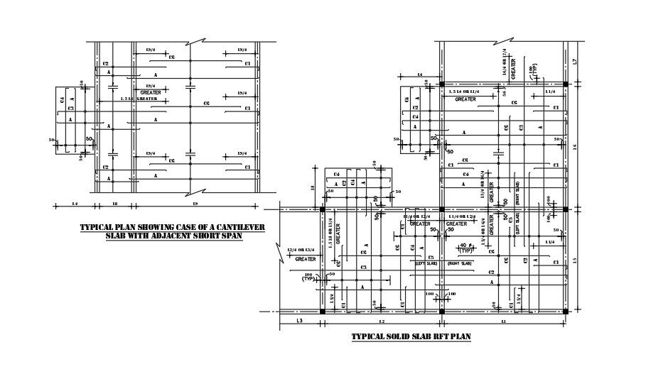 This Architectural Drawing is Typical plan showing case of cantilever slab with adjacent short span. A cantilever is a rigid structural element that extends horizontally and is supported at only one end. Typically it extends from a flat vertical surface such as a wall, to which it must be firmly attached. Like other structural elements, a cantilever can be formed as a beam, plate, truss, or slab. The deflection limit for cantilever beams set by most design codes is L/180 for live load and L/90 for combined dead & live load. The maximum span depends on the material of the beam (wood, steel or concrete). A cantilever is a protruding beam that's supported on only one side. Rooted in physics and structural design, a cantilever can be a stunning architectural element or just a clever way to add a little more light to a room. Discover how designers are incorporating cantilevers in home design, in both major and minor ways. For more details and information download the drawing file.