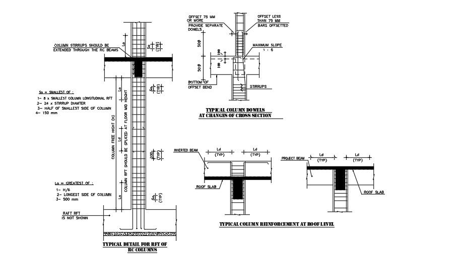 Typical Detail for RFT of RC Columns and Column Reinforcement at Roof Level.