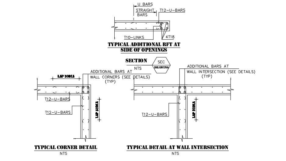 This Architectural drawing is section drawing of typical RFT at side of openings, corner details and wall intersection. Structural detailing consists of transforming the work of a structural engineer into working drawings for the use of the builder. It sounds quite simple. That it is not is evidenced by the many 'bog-ups' and even failures, that are constructed. Plan drawings are in fact a type of section, but they cut through the building on a horizontal rather than vertical plane. The direction of the plane through which the section is cut is often represented on plan drawings and elevations by a line of long and short dashes, called a section plane. For more details and information download the drawing file.