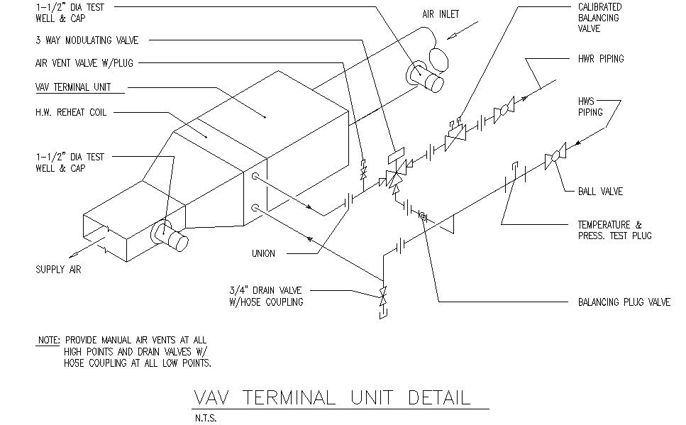Vav terminal unit details including 3 way modulating valve air vent valve w / plug vav terminal unit , h. w reheat coil , union , ball valve , temperature and press test plug HWR piping , calibrated piping valve , balancing plug valve , air inlet VAV systems supply air at a variable temperature and airflow rate from an air handling unit (AHU). A VAV terminal unit, often called a VAV box, is the zone-level flow control device. It is basically a calibrated air damper with an automatic actuator. The VAV terminal unit is connected to either a local or a central control system. also a device that is used to regulate the volume of conditioned primary air from the central air handler to the occupied space. for more details of Vav terminal unit details download this file.