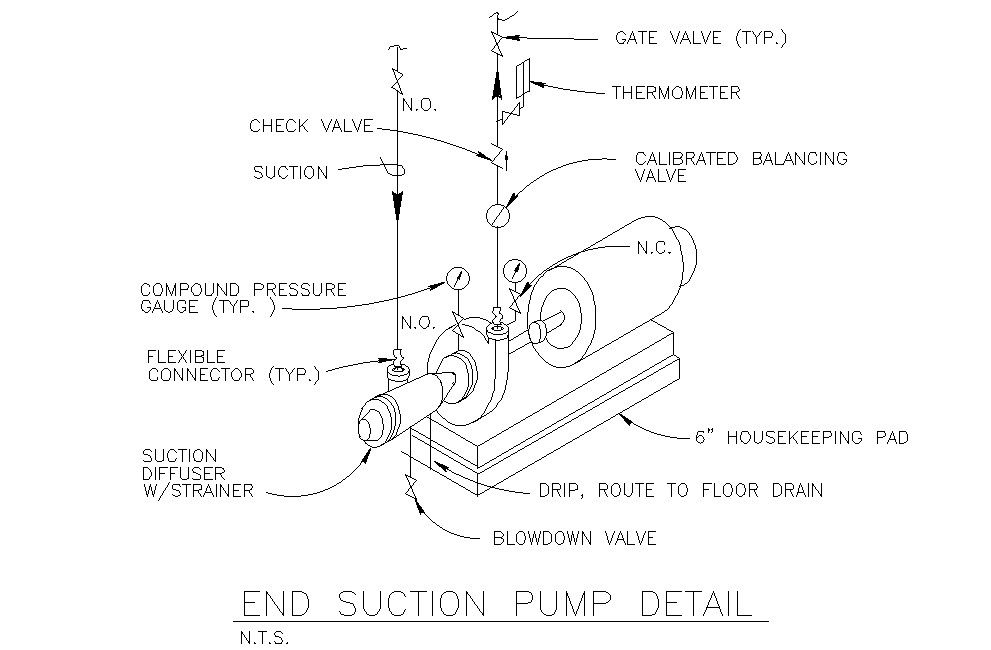 Here end suction pump details including thermometer ,check valve , suction ,gate valve , blow down valve , calibrated balancing valve , drip route to floor drain , house keeping pad (6'') , compound pressure gauge , flexible connector , suction diffuse w/strainer according to national technical system An end suction pump is a centrifugal pump that has a casing with suction going out one end and discharge coming out the other. These pumps are usually a single stage with only one impeller. this end suction pumps are used in water supply, industrial applications for pressure boosting and liquid transfer, ventilation, air-conditioning and heating and agricultural / irrigation applications. for more details of End suction pump details download this file.