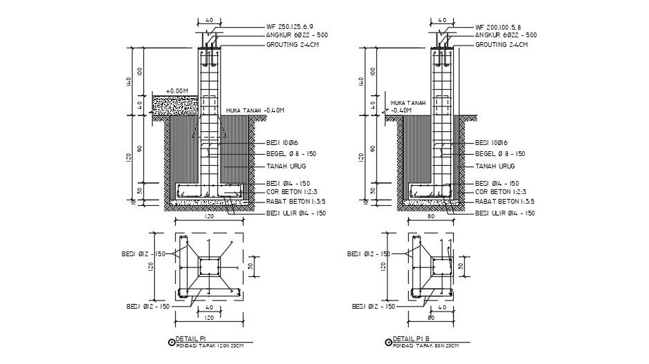 This Architectural Drawing is section of column foundation detail with dimension. Column footing size for 1 storey (G+0) building:- for 1 storey (G+0) house or in simple ground floor building, general thumb rule, using standard 9″ thick walls, we recommended size of column footing should be 3.5'×3.5'×3.5′ (1m x 1m×1m) for isolated footing shallow foundation in gravel and sand soil with higher. The average foundation wall, whether poured concrete or block, is 8 to 10 inches. The walls should be reinforced and made thicker if the hydrostatic pressure -- pressure from soil water -- is very high. Increasing the thickness and strength of the walls is necessary if they must fight both leaks and soil pressure. The minimum depth of footings below the surface of undisturbed soil, compacted fill material or controlled low strength material (CLSM) shall be 12 inches (305 mm). Where applicable, the requirements of CBC Section 1809.5 shall also be satisfied. The minimum width of footings shall be 12 inches (305 mm). The side dimension of the footing varies between 850 mm and 1800 mm, while the depth (d) varies between 100 mm to 470 mm. The dimensions of column stubs (c) are varying from 175 mm to 200 mm. For more details and information download the drawing file.