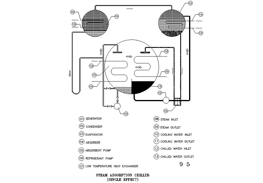 Here absorption chiller diagram his absorption cooling cycle relies on three basic principles: When a liquid is heated it boils (vaporizes) and when a gas is cooled it condenses. Lowering the pressure above a liquid reduces its boiling point. Heat flows from warmer to cooler surfaces. An absorption chiller is consisted of four main parts: generators, condensers, evaporators, and absorbs. We can model the absorption chiller by considering the energy balance in the four parts. Absorption chillers collect waste heat from other processes and equipment to drive thermodynamic processes that allows water to be chilled and distributed for HVAC needs. Absorption chillers do not use mechanical compressors, instead making use of the absorption refrigeration cycle. Accepted refrigerants for this application are: R-410A, R-404A, R-407C and R-134a are accepted on all chillers, except for those with scroll compressors. However the GWP of these refrigerants is high, thus their prices are increasing and availability is decreasing