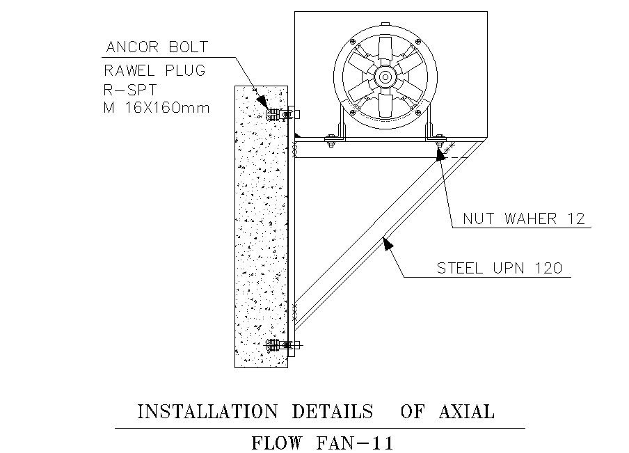 Here axial flow fan installation details , axial fan is a type of fan that causes gas to flow through it in an axial direction, parallel to the shaft about which the blades rotate. The flow is axial at entry and exit. The fan is designed to produce a pressure difference, and hence force, to cause a flow through the fan.The most basic part of an axial flow fan is the motor. Other than that it has ball bearings, blades, and impellers. The fan has a housing or an enclosure which protects it from external damage, spillage, shock, vibration, In a typical axial fan, the effective progress of the air is straight through the impeller at a constant distance from the axis. The primary component of blade force on the air is directed axially from inlet to outlet and thus provides the pressure rise by a process that may be called direct blade action. including nut waher , steel UPN 12 , anchor bolt , ravel plug( 160mm x160mm ) for more details of axial flow fan installation download this file .