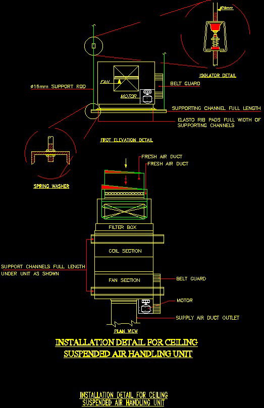 Here ahu installation procedure ( celling suspended ) They are usually located in the basement, on the roof or on the floors of a building. AHU's will serve a specified area or zone within a building such as the east side, or floors 1 – 10 or perhaps a single purpose such as just the buildings toilets. Therefore, it's very common to find multiple AHU's around a building. AHU is a large metal box containing separate ventilators for supply and exhaust, heating coil, cooling coil, heating/cooling recovery system, air filter racks or chambers, sound attenuates, mixing chamber, and dampers. including fan section , coil section , filter box , Belt guard , 16mm support rod , motor,supply air duct outlet ,support channel full length, under unit as shown in drawing also plan view ,front elevation view Inside an AHU we will typically find two sets of filters. The first set is known as the primary filters and we also then have the secondary filters. These both have different functions in an air handling unit. for more details download this file.