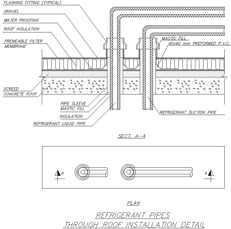 Here Refrigerant pipe for roof installation including flashing fitting ,gravel .copper pipe , roof installation ,mastic fill , refrigerant liquid pipe , refrigerant suction pipe ,40mm x40mm preformed PVC, Hardened copper tubing is used for water lines, commercial refrigeration and HVAC. This type of tubing is joined using grooved, compression, crimped, or sweat connections. Lengths may be more or less, depending on remaining system design factors. Maximum linear (actual) length = 200 feet. Maximum linear liquid lift = 60 feet.in refrigerant installation required The temperatures and pressures in many refrigerant piping systems exceed the rated pressure for solder joints for more details of Refrigerant pipe for roof installation download this file.